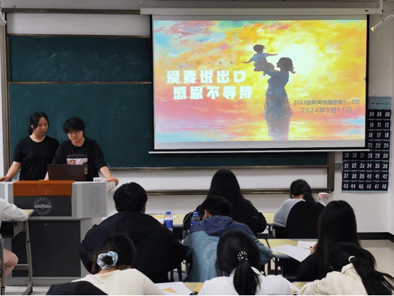 “同學們,猜一猜明天是什么節日?。俊薄澳赣H節!”5月11日,新聞傳播學類專業2023(7)、(8)班在K202教室開展以“愛要說出口,感恩不等待”為主題的團建活動。活動開始前,活動負責人、新聞傳播學類專業2023(7)、(8)班的班長楊雨霏、朱研溪提前為每位同學準備好信紙和信封。朱研溪說:“我們希望通過寫信這種傳統而深情的溝通方式,讓同學們勇敢表達自己的心聲,將對母親的愛訴說于筆尖。”學生們觀看一段關于母愛的感人短片后,...